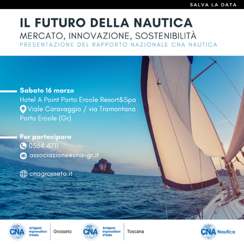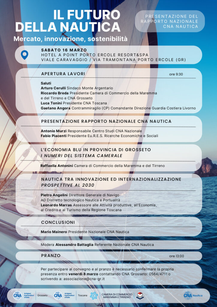 “Il futuro della nautica. Mercato, innovazione, sostenibilità” è il titolo dell’evento promosso da CNA Grosseto, insieme a CNA Nautica, CNA Toscana e il patrocinio della Camera di commercio della Maremma e del Tirreno, in programma per sabato 16 marzo all’hotel A Point di Porto Ercole (Monte Argentario).