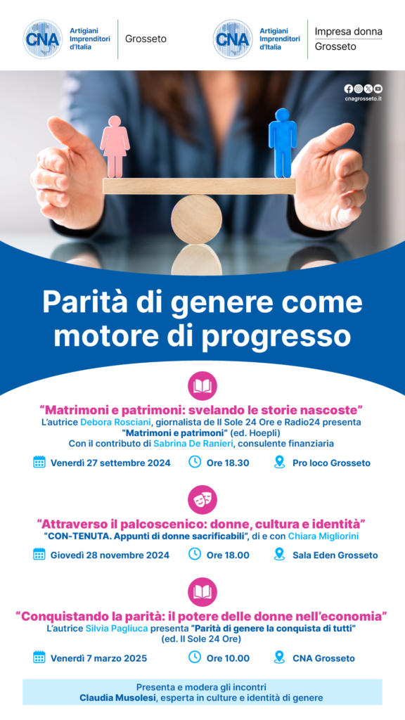 Venerdì 7 marzo, alle 10, nella sede di CNA Grosseto è in programma “Conquistando la parità: Il potere delle donne nell’economia”. L’autrice Silvia Pagliuca presenta “Parità di genere la conquista di tutti” (ed. Il Sole 24 Ore).